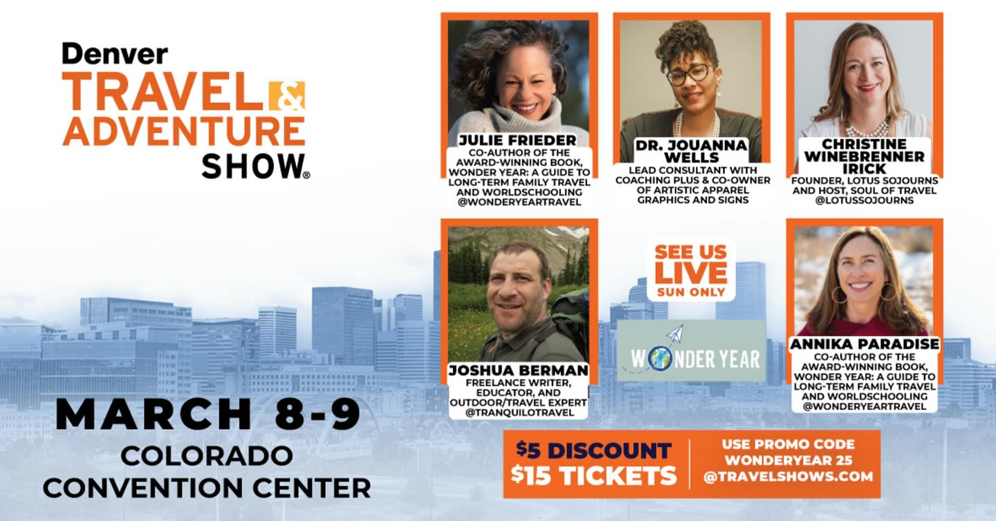 We’re so excited to be featured speakers at the 2025 Denver Travel and Adventure Show! We are hosting a panel discussion about travel outside the box. With the wide ranging experiences of the panelists, we’ll cover topics such as family travel, getting off the beaten path, solo travel and microadventuring on a dime. Participants will leave the session with new ideas and the confidence to try new things, learn a new language, and discover new sides of themselves and their travel companions. The Travel Show is a bustling event where you can get inspiration, hear knowledgeable speakers and win great prizes. Use promo code Wonderyear25 to get a $5 discount on tickets and stop by our booth #537 to say hello!
